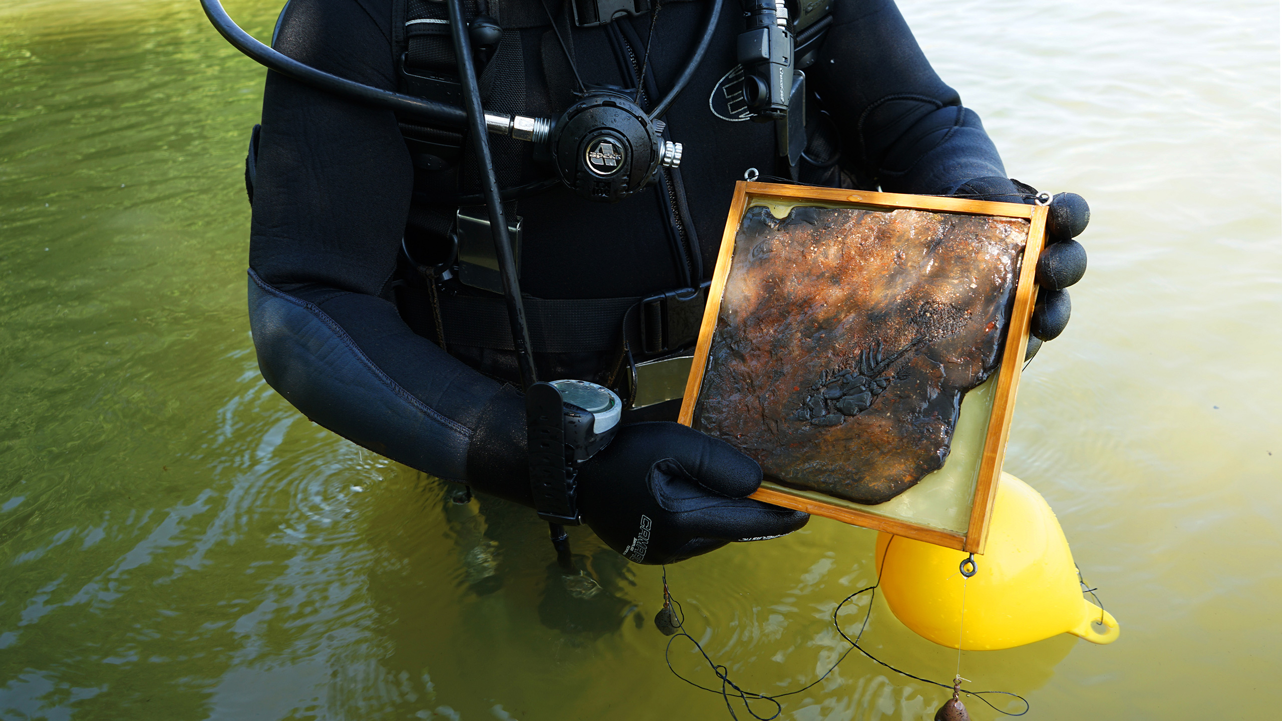 As final step in the project, the replica was brought to the original finding spot inside the Blausteinsee. Carried by two local divers, the fossil was brought 40 meter down in the lake. To our surprise, the only fish caught on video were Round Goby’s - the exact fish species which used to live here during the Pliocene and which ascended from the fossilized fish. On its way down, the divers filmed their encounters with these fish and the industrial remnants of the underwatermuseum which was placed here by the lignite industry, illustrating the idle hope to make this place into a new, bustling diving hotspot. Amongst ambivalent objects like sunken car tires, christmas trees and toilet seats, the fish fossil is permanently installed at the bottom of the lake as a valuable and meaningful object, showing the site-specific history and changing of this landscape to the divers visiting the lake.