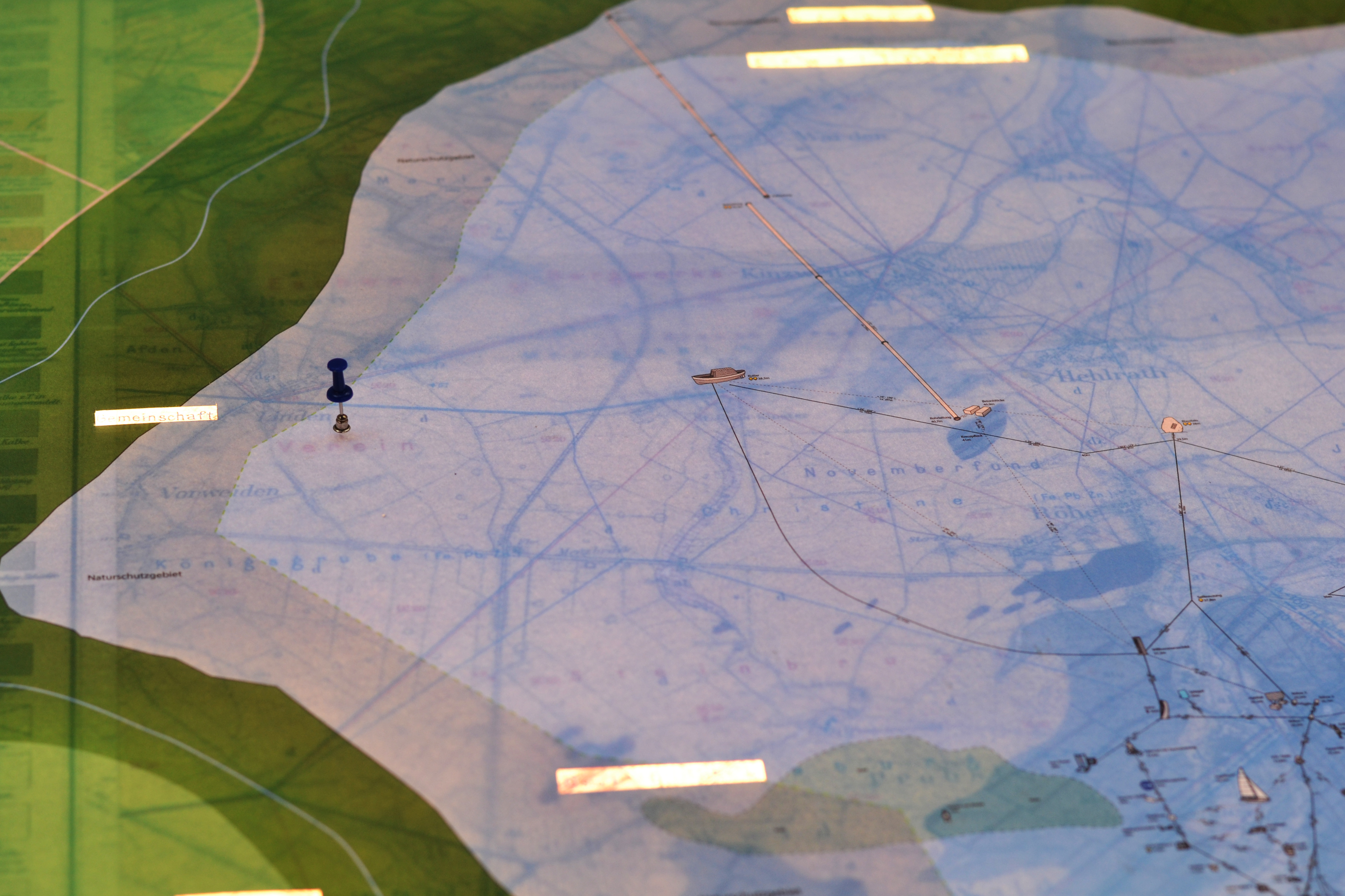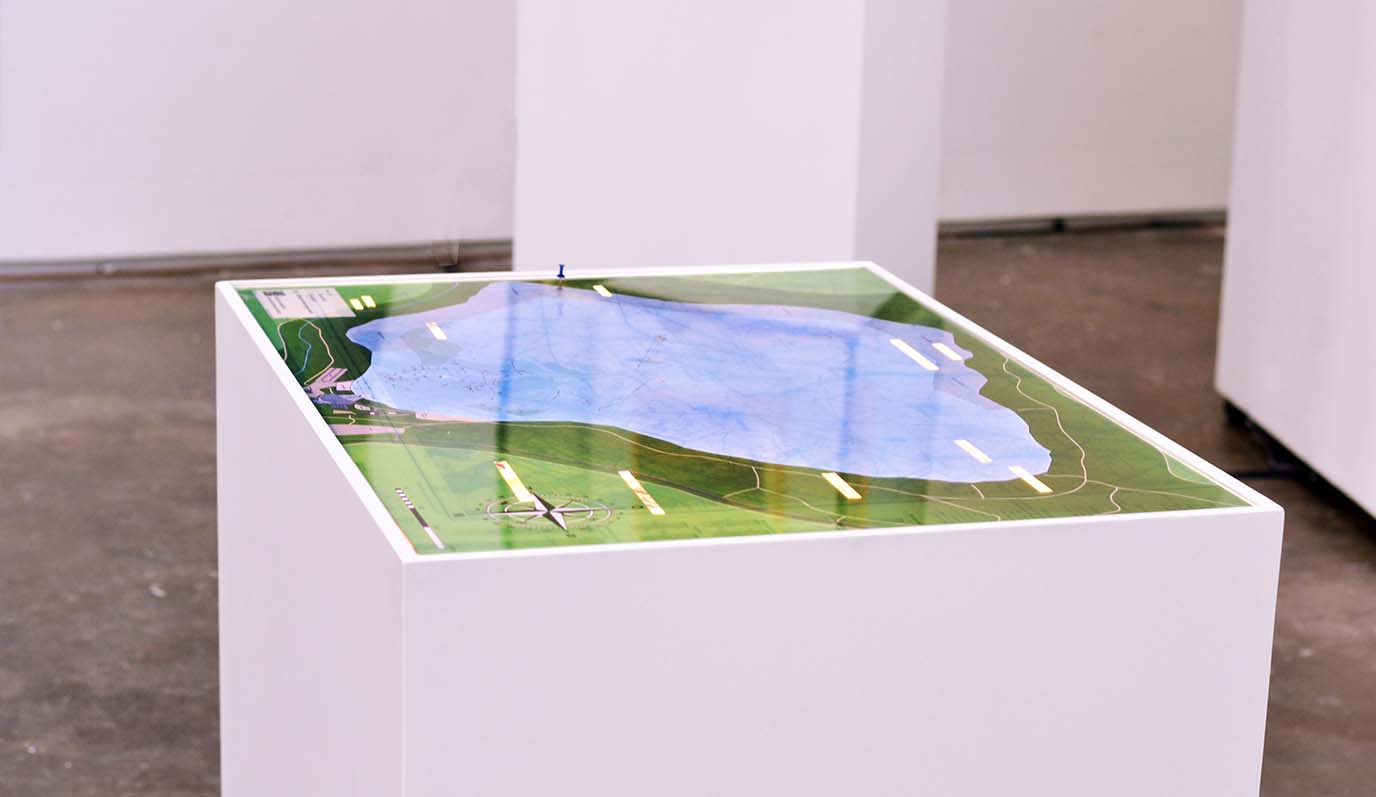 Exhibition view Descent into the Future: Map of previous landscape (1904) and new diving map of the recultivated landscape (Blausteinsee), July 2021