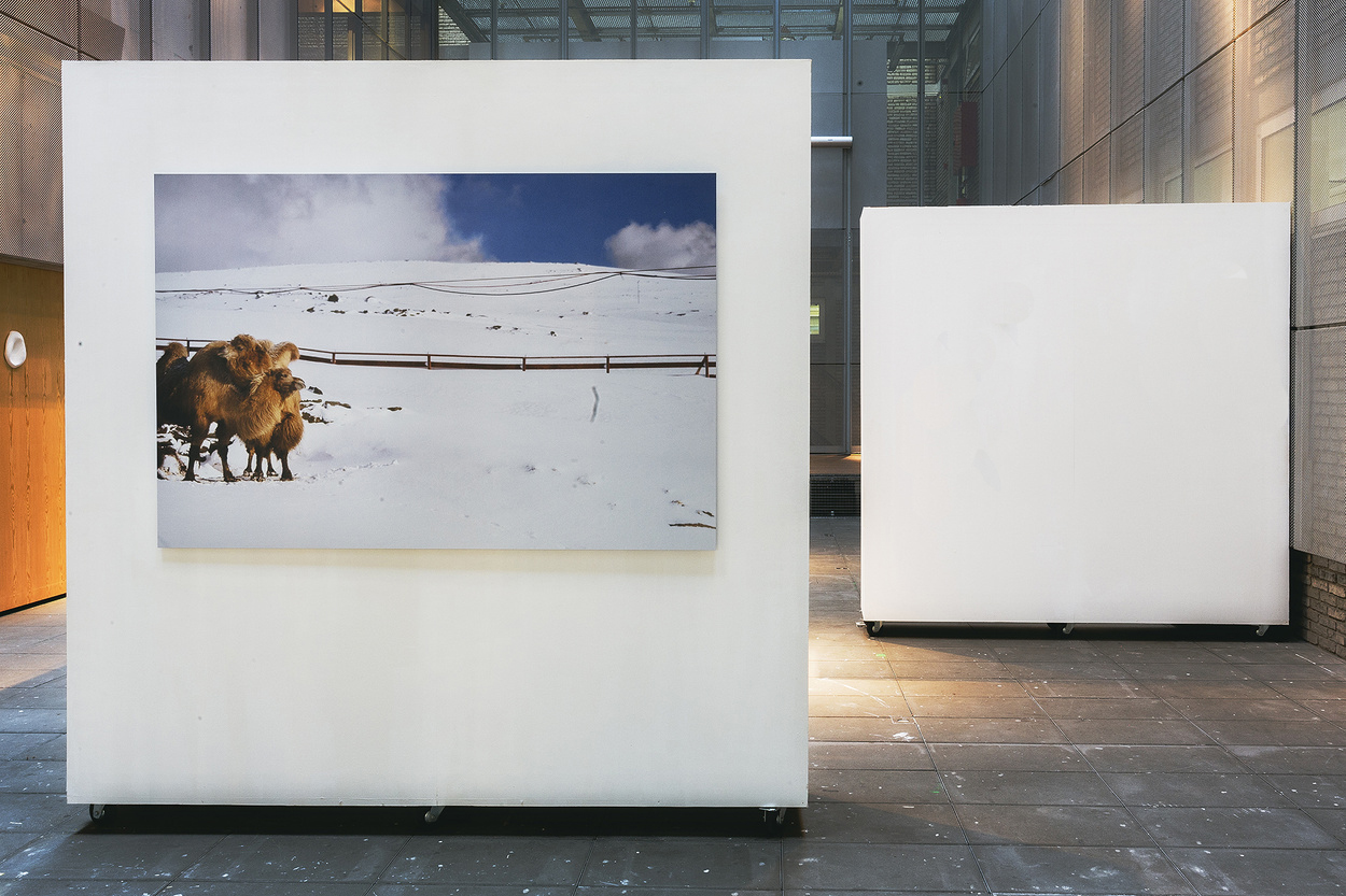 Although camels are often believed to only inhabit tropical places on earth, their bodies are in fact equally well-adapted to roam the cold regions of the north. Scientists discovered camel fossils on the island of Ellesmere, which has the same latitude as Spitsbergen. The installation in KRIEG Gallery consisted of a pop-up filling station, inviting the visitor to fill his waterbottle with water extracted from the hump of a camel. During the exhibition, the literary role of camels as a ‘water-container’ has been questioned; a role which they often fulfill in children books and movies. The work contrasts this false perception with a photograph of the two Arctic camels; a real photograph, which in turn has been mistaken as a photoshop manipulation by many visitors.